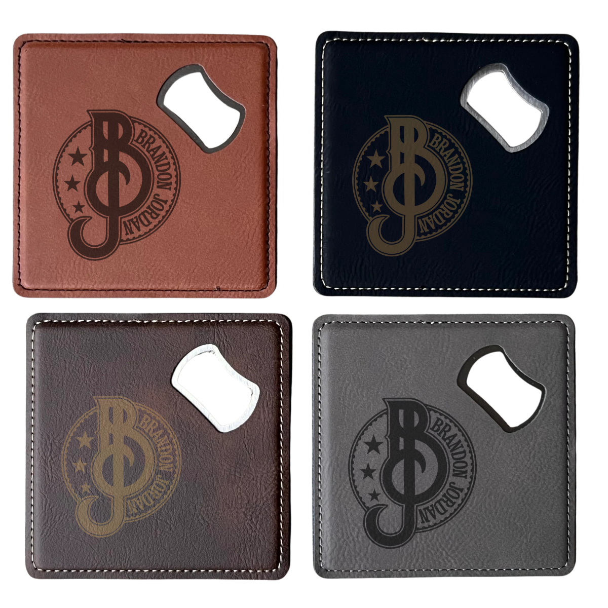 Price includes 1 laserable leatherette bottle opener/coaster. Coaster is blank and ready for you to customize. Engraving not included. * Laserable leatherette offers the look and feel of genuine leather at a fraction of the price * This richly textured, synthetic material resists water spots, cleans easily, and is durable enough for the rigors of daily use * Laserable leatherette is made of: polyurethane, wood powder and polyester * PVC FREE!